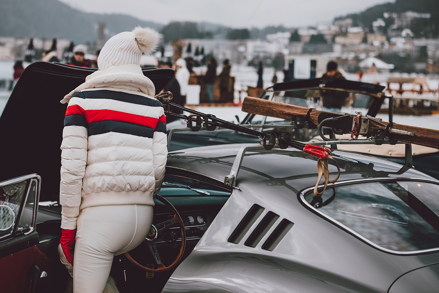 Ferrari 275 GTB photography showing a person in white winter attire with ski gear mounted on a classic silver Ferrari at the St. Moritz Concours d'Elegance 2023