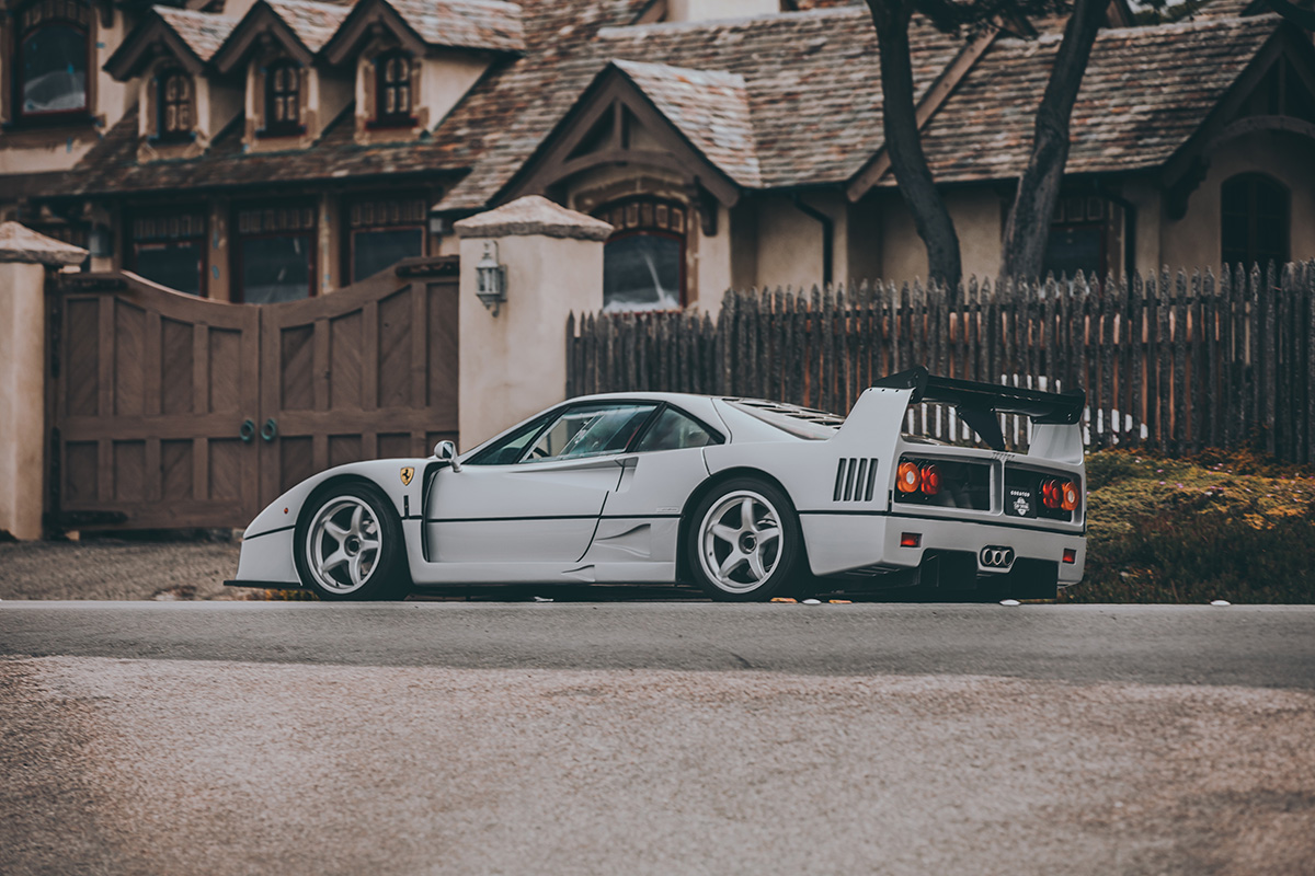 Captured during an exclusive photoshoot at Cars and Roses, this grey Ferrari F40 showcases the raw, aggressive lines and distinctive rear wing that made this supercar a legend. The contrast between the modern supercar and the traditional architecture creates a timeless artistic composition.
