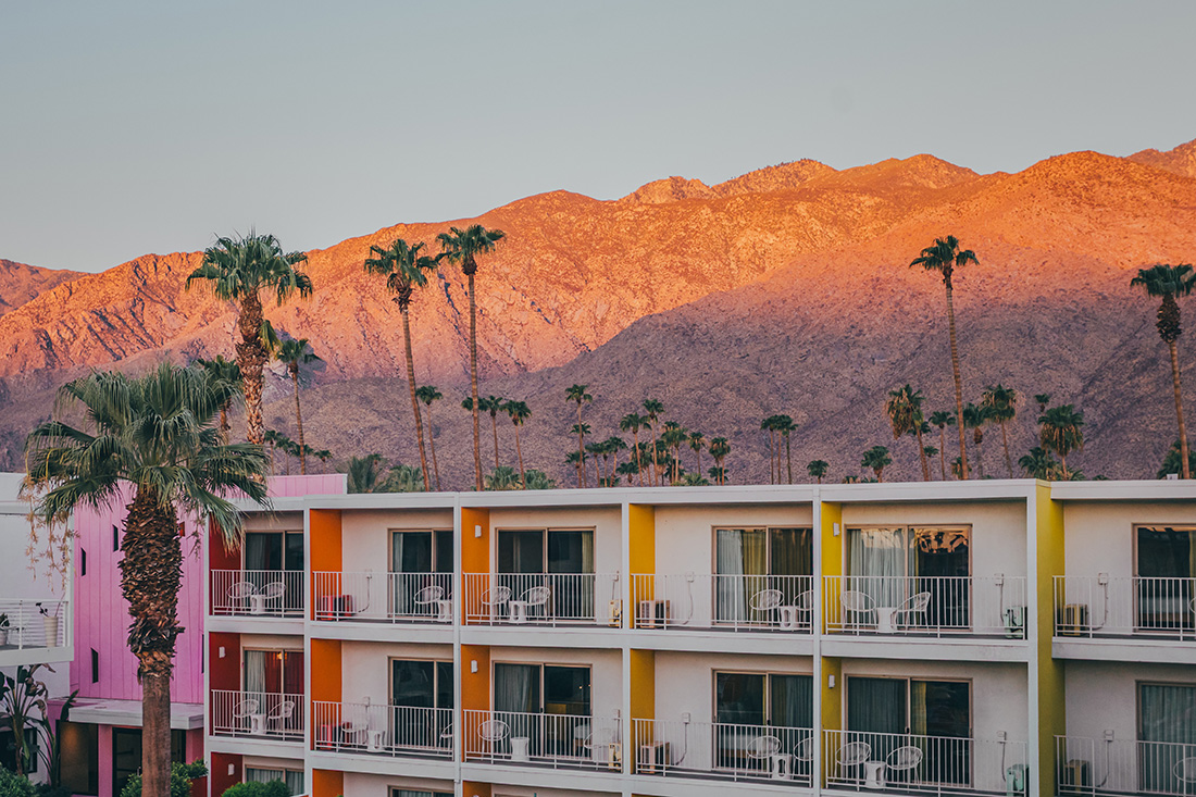 Located in the heart of Palm Springs, California, The Saguaro is famous for its mid-century modern architecture reimagined with a rainbow color palette. Nestled at the foot of the San Jacinto Mountains, the hotel embodies the festive and artistic spirit of the California desert. The sunset transforms the mountains into a natural canvas of pinks and oranges, creating an unforgettable daily spectacle appreciated by photographers and travelers from around the world.